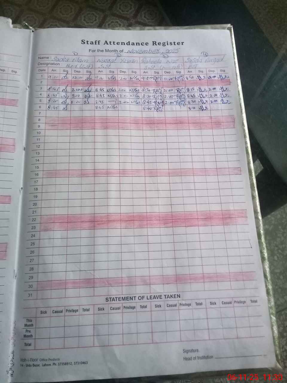 | CNIC | Full Name | Designation | R/C | Absence During Last Calender Month |
