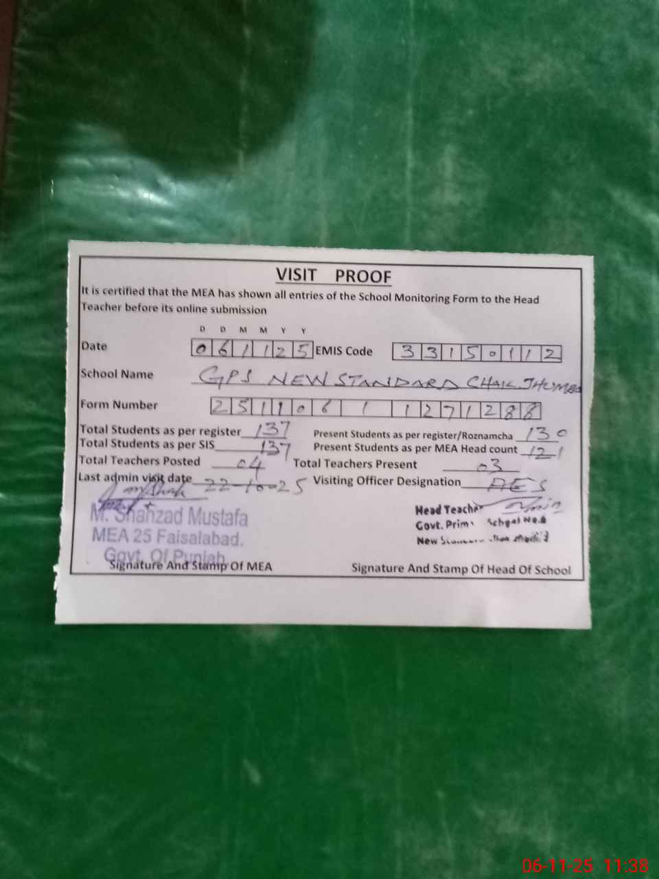 | Attendance Register | Head Teacher | MEA with School | Visit Proof |