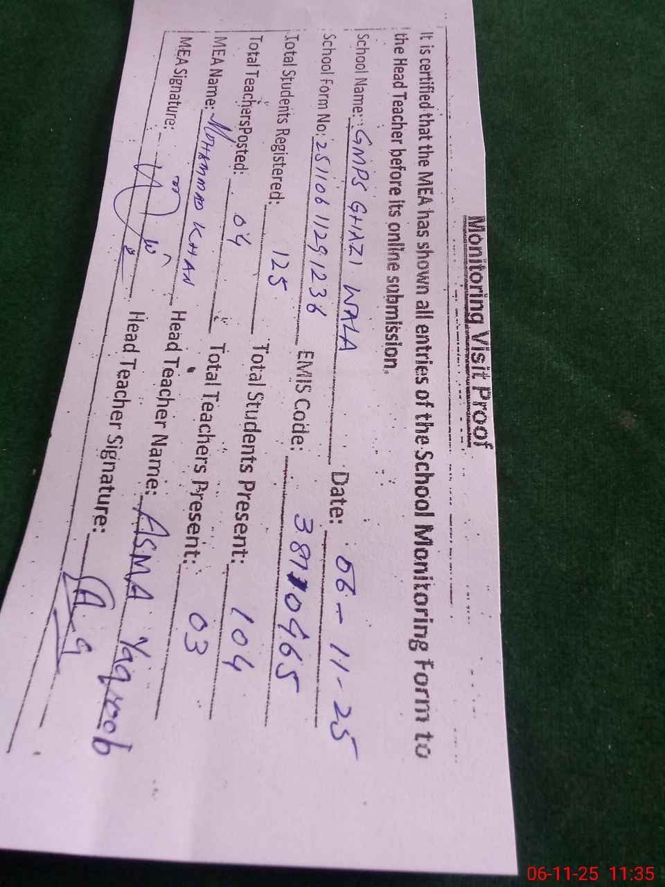 | Monitoring Date: 06-11-2025 | Start Time: 06-11-2025 10:36 AM | End Time: 06-11-2025 11:39 AM | Name of MEA: Mu**** Kh**** | |