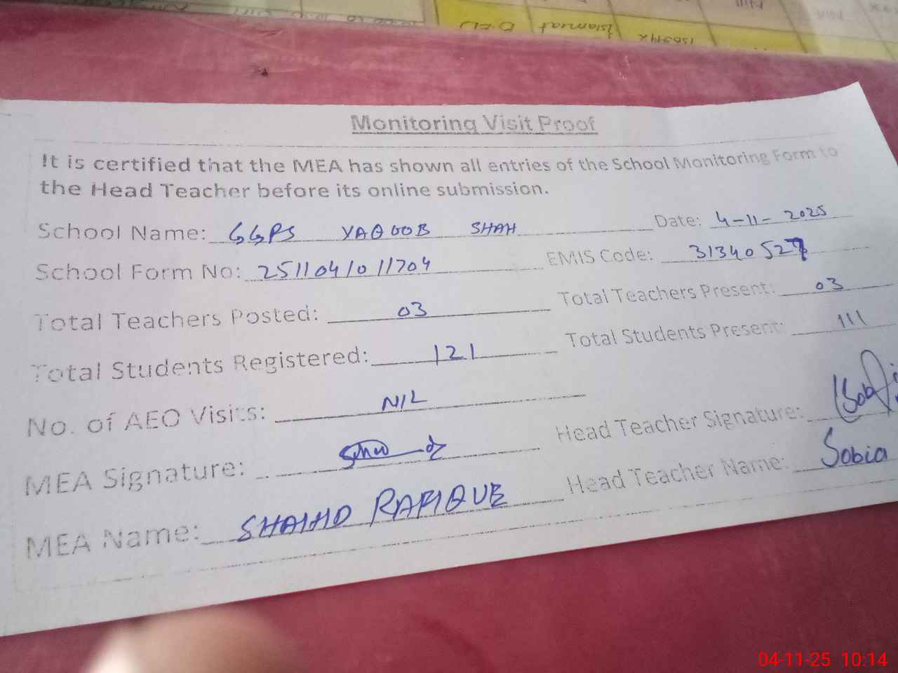 | EMIS Code: 31340527 | Name of School: GGPS YAQOOB SHAH | |||