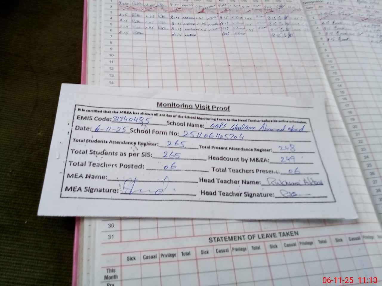 | Attendance Register | Head Teacher | MEA with School | Visit Proof |