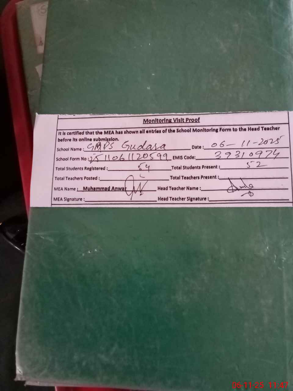 | Attendance Register | Head Teacher | MEA with School | Visit Proof |