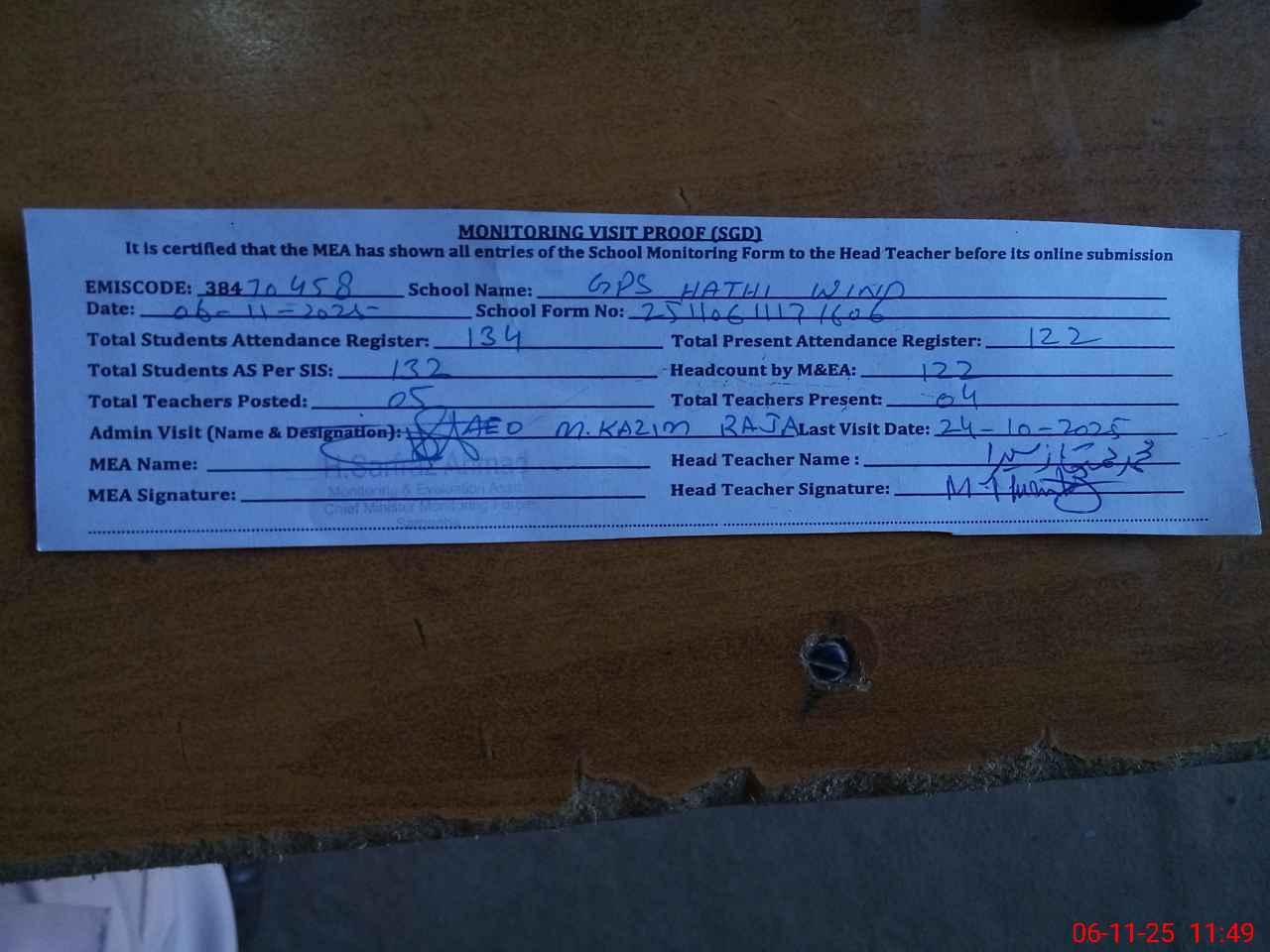 | Attendance Register | Head Teacher | MEA with School | Visit Proof |