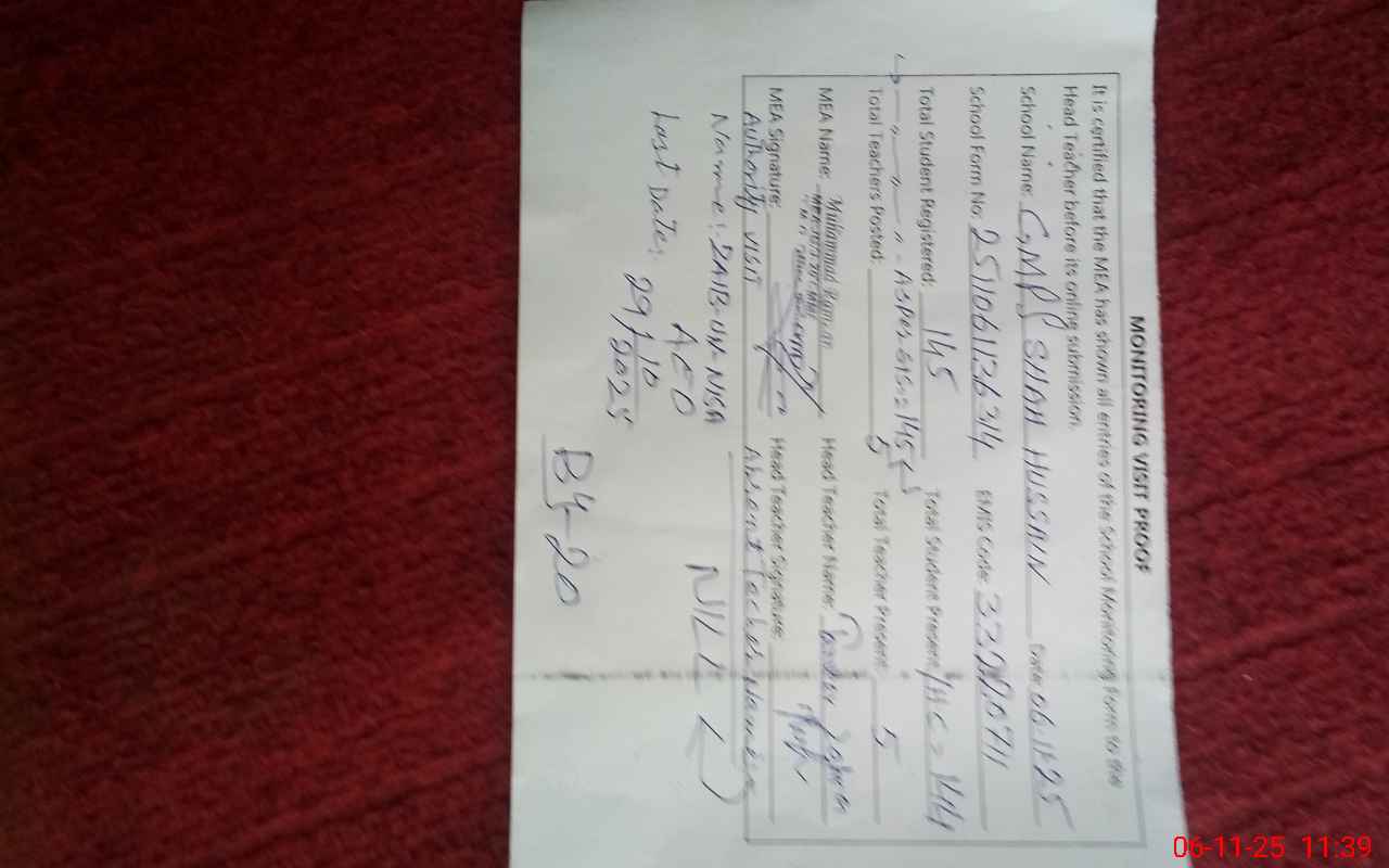 | Attendance Register | Head Teacher | MEA with School | Visit Proof |