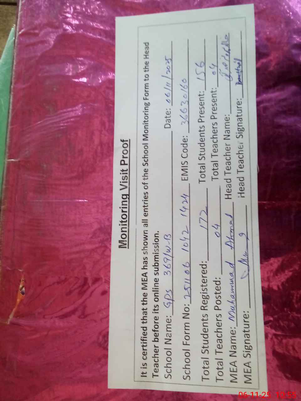 | Attendance Register | Head Teacher | MEA with School | Visit Proof |