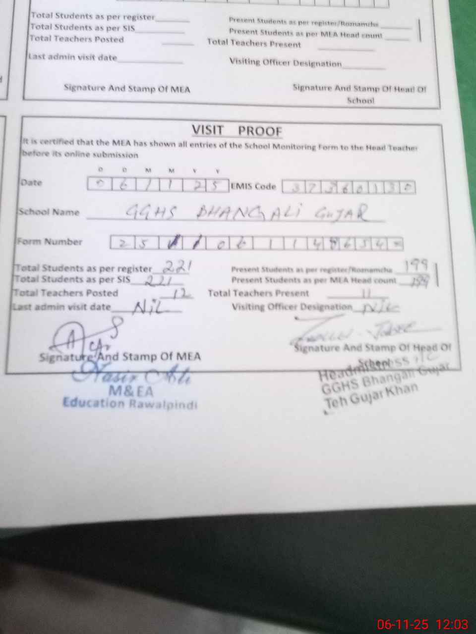 | Attendance Register | Head Teacher | MEA with School | Visit Proof |