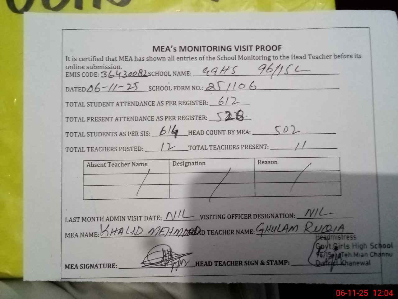 | Attendance Register | Head Teacher | MEA with School | Visit Proof |