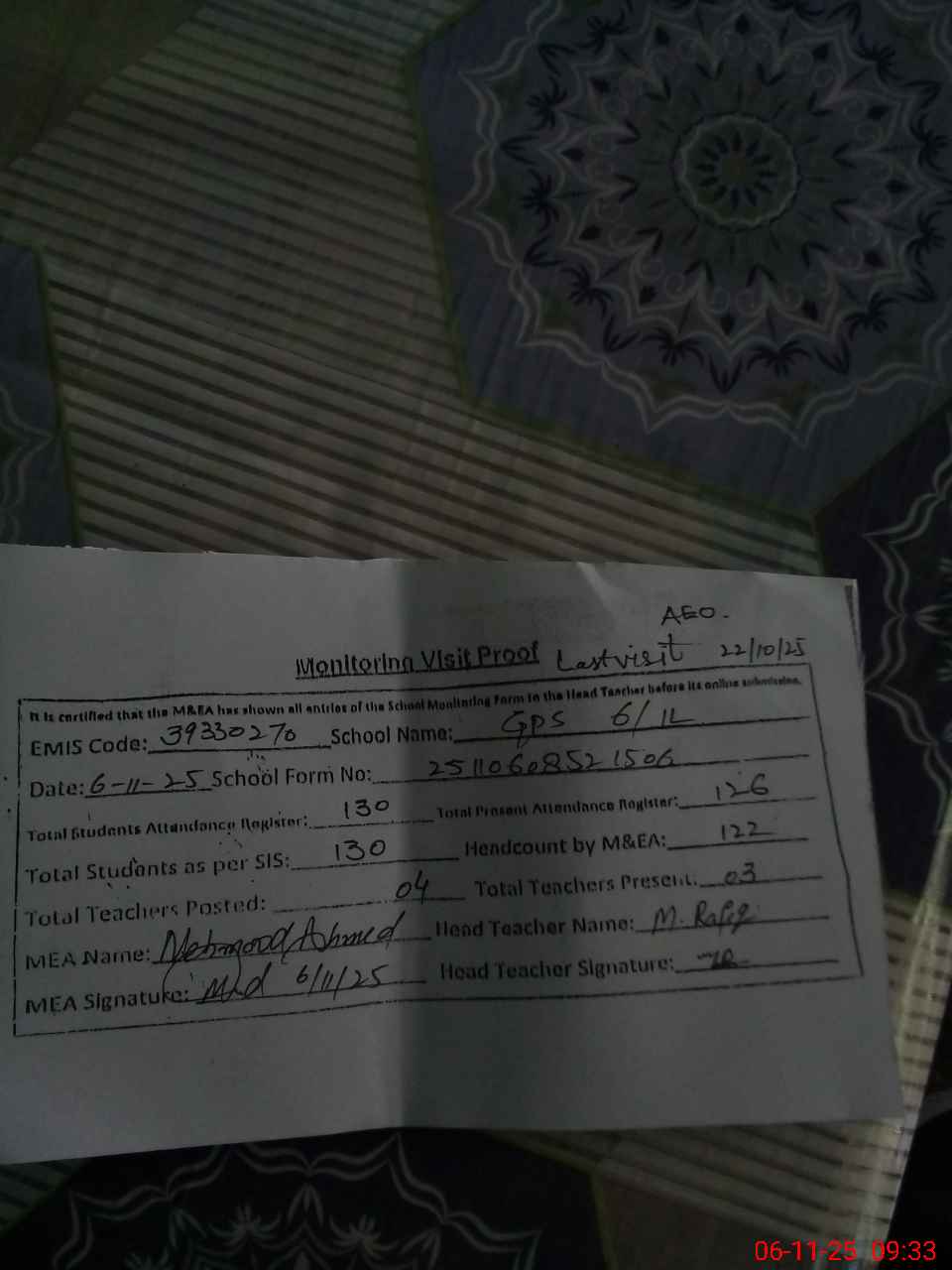 | Attendance Register | Head Teacher | MEA with School | Visit Proof |