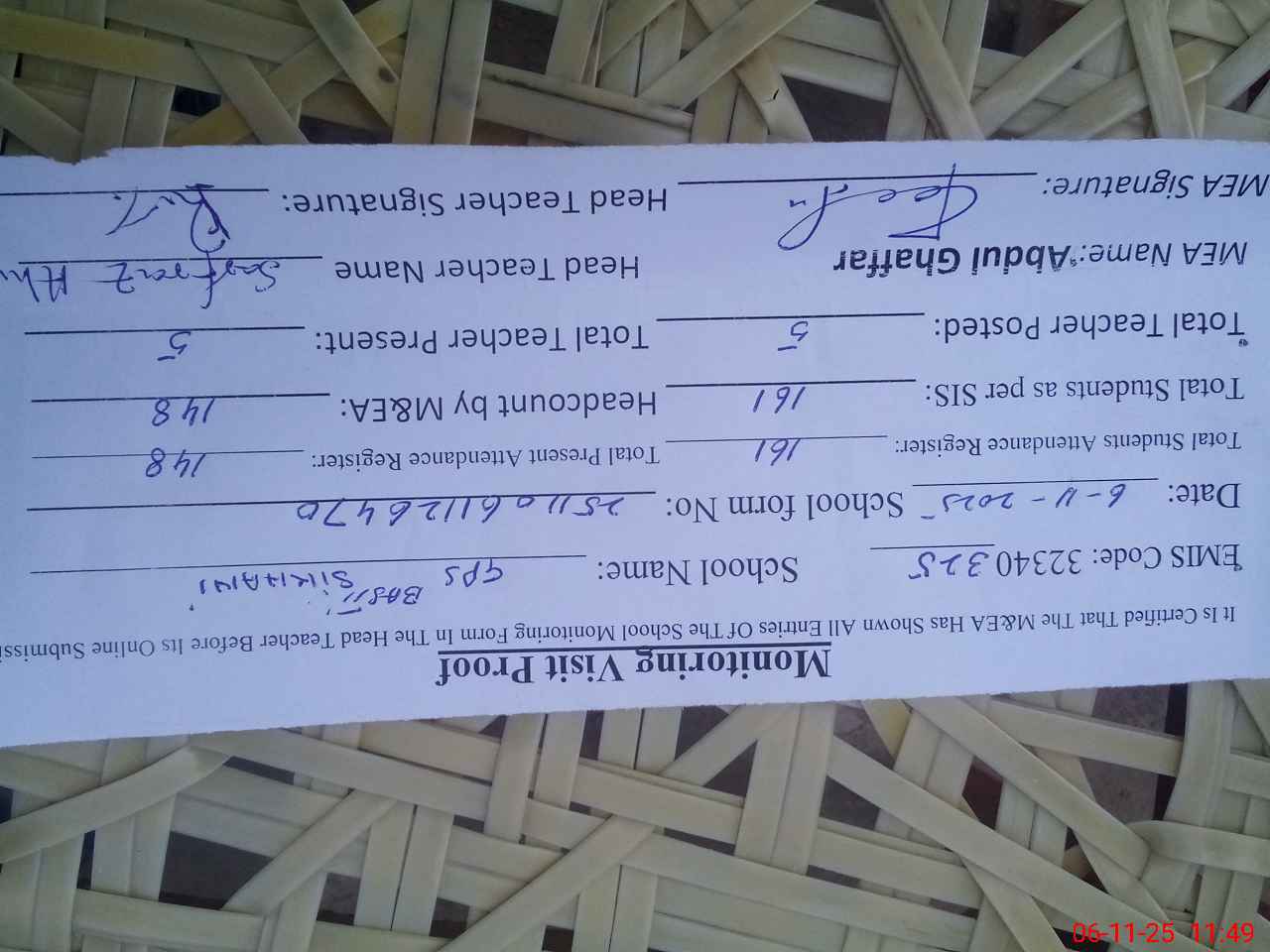 | Attendance Register | Head Teacher | MEA with School | Visit Proof |
