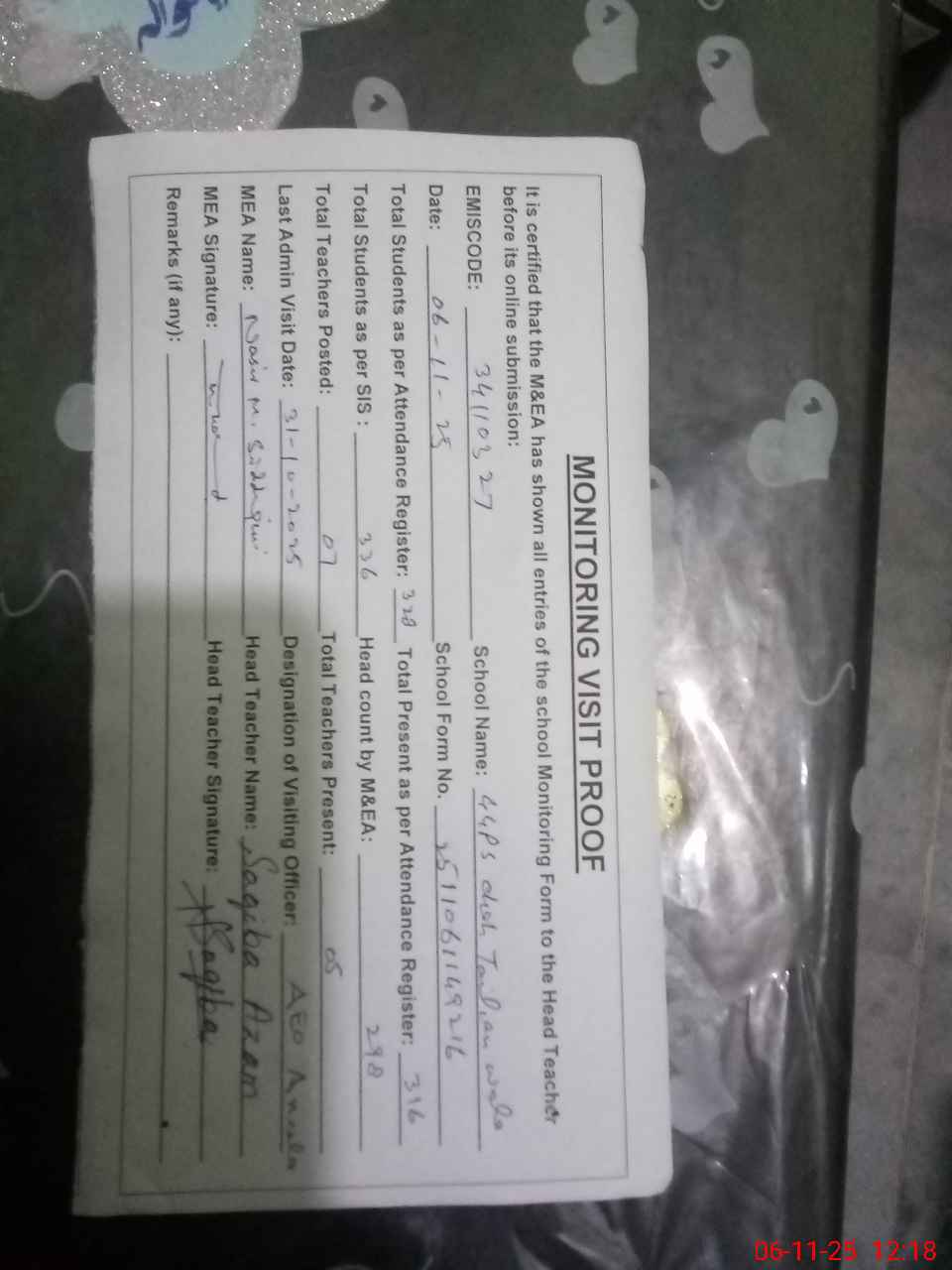 | Attendance Register | Head Teacher | MEA with School | Visit Proof |