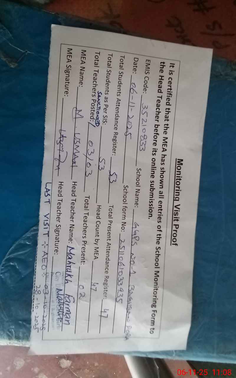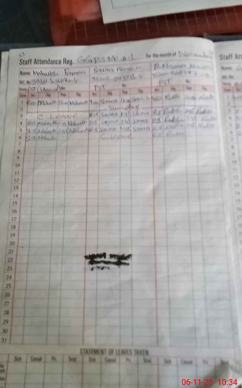 | Remarks (Use Separate Page if Required): Total 07 class rooms in said school and all are dangerous locally since 2023 Building department has visited the Said school on 21 August 2025 01 teacher is absent due to leave record was not available | |||||