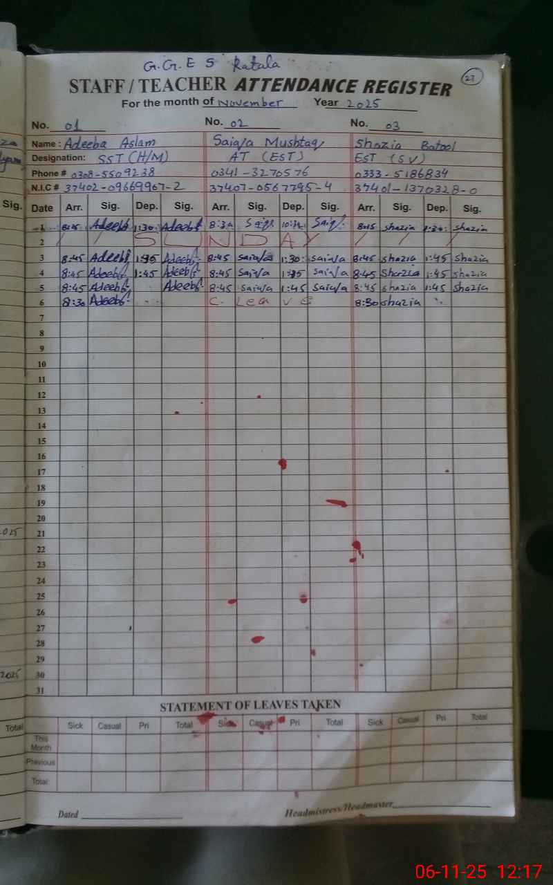 | CNIC | Full Name | Designation | R/C | Absence During Last Calender Month |