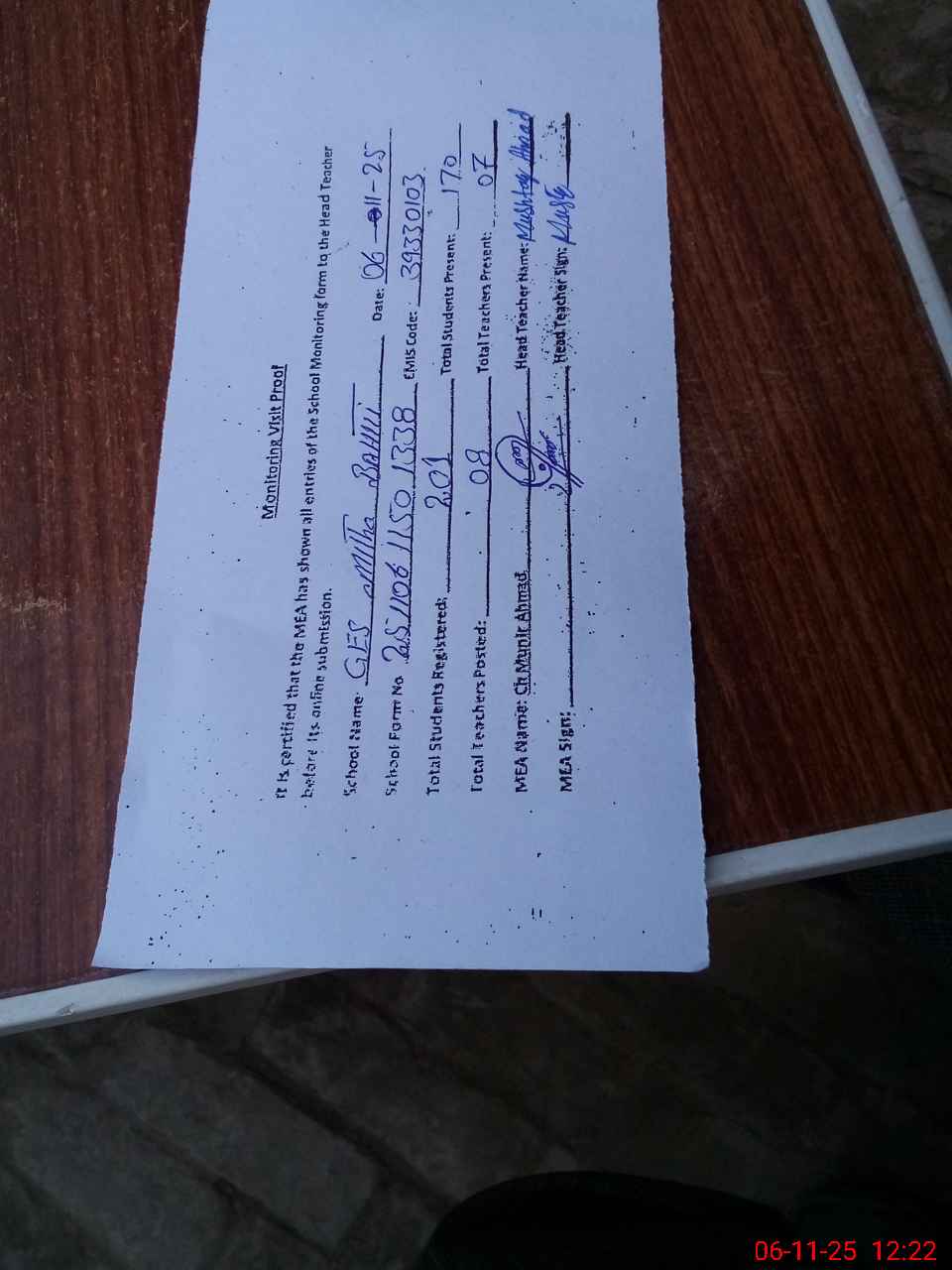 | Attendance Register | Head Teacher | MEA with School | Visit Proof |