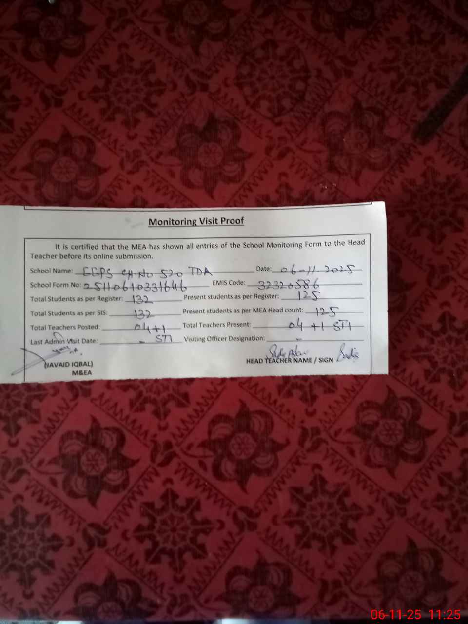 | Attendance Register | Head Teacher | MEA with School | Visit Proof |