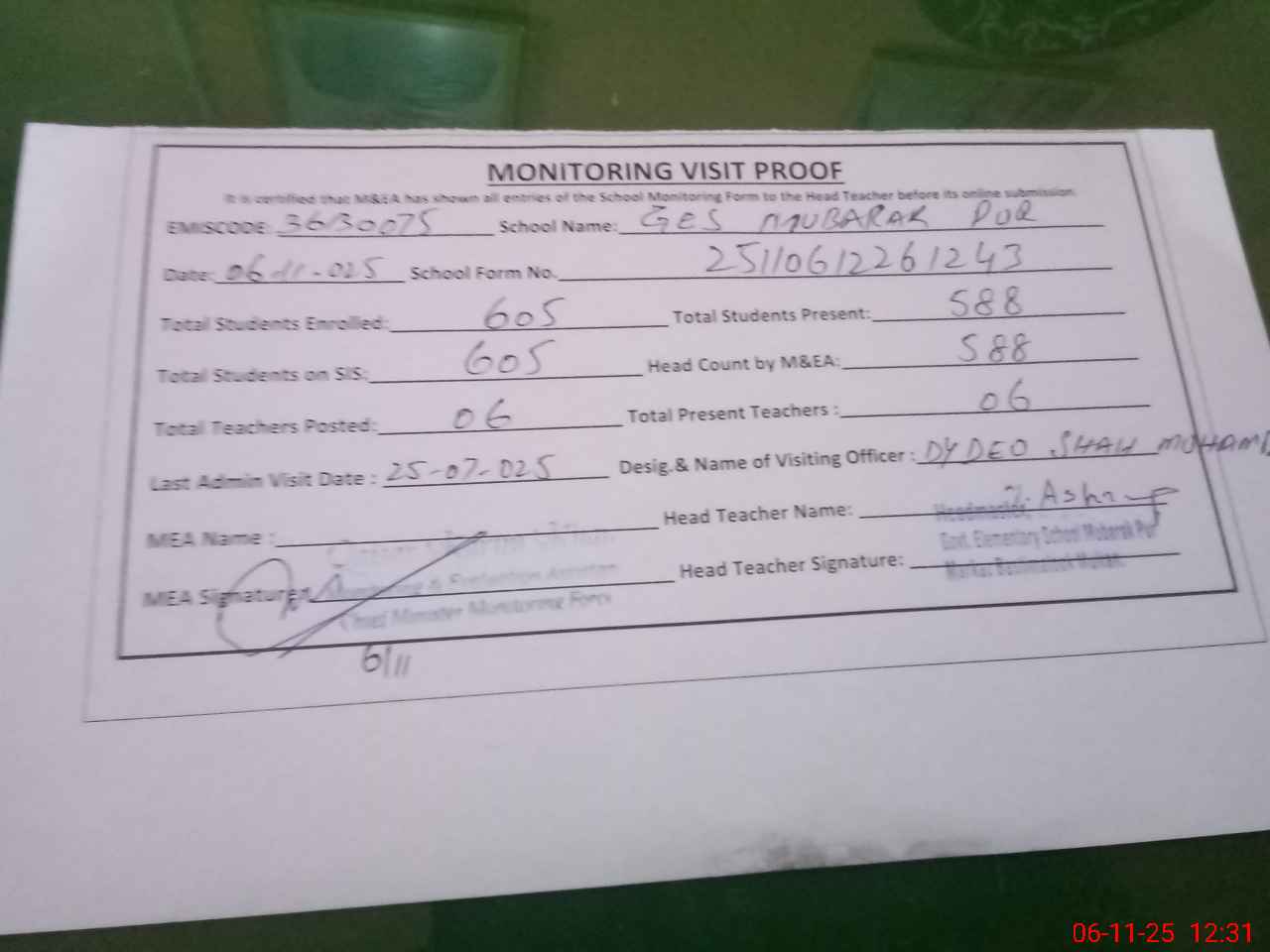 | Attendance Register | Head Teacher | MEA with School | Visit Proof |