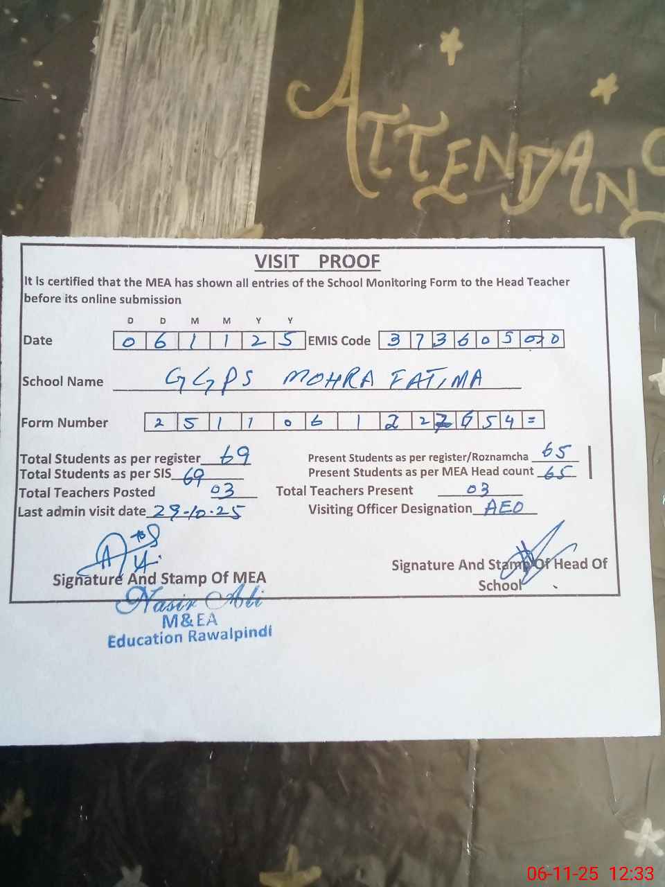 | EMIS Code: 37360500 | Name of School: GGPS MOHRA FATIMA | |||