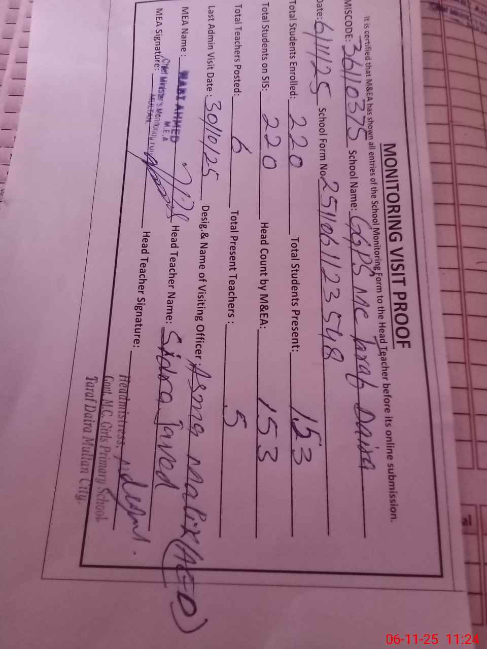 | Attendance Register | Head Teacher | MEA with School | Visit Proof |