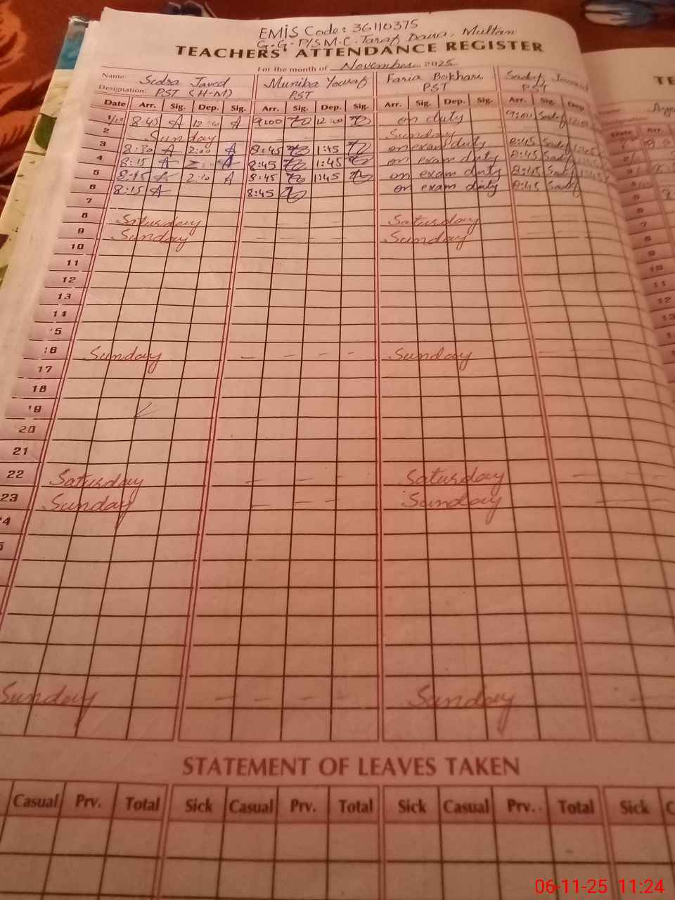 | 36**** | Fa**** Bo**** | ESE Arts | Regular | 0 | 0 | 0 | 0 | 0 | 0 | 0 | 0 | 0 | Exam Duty |