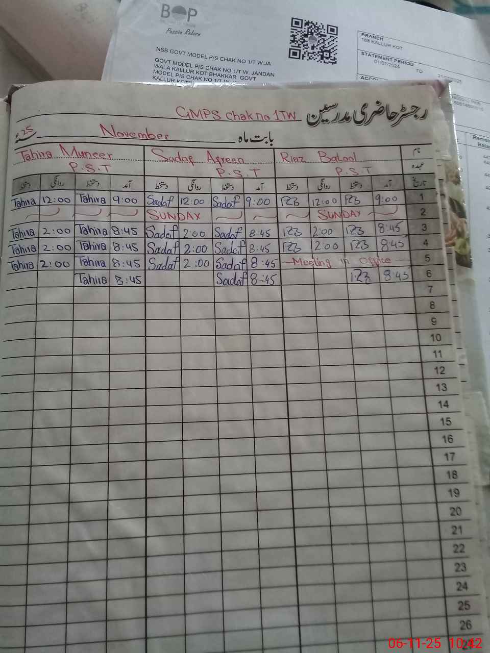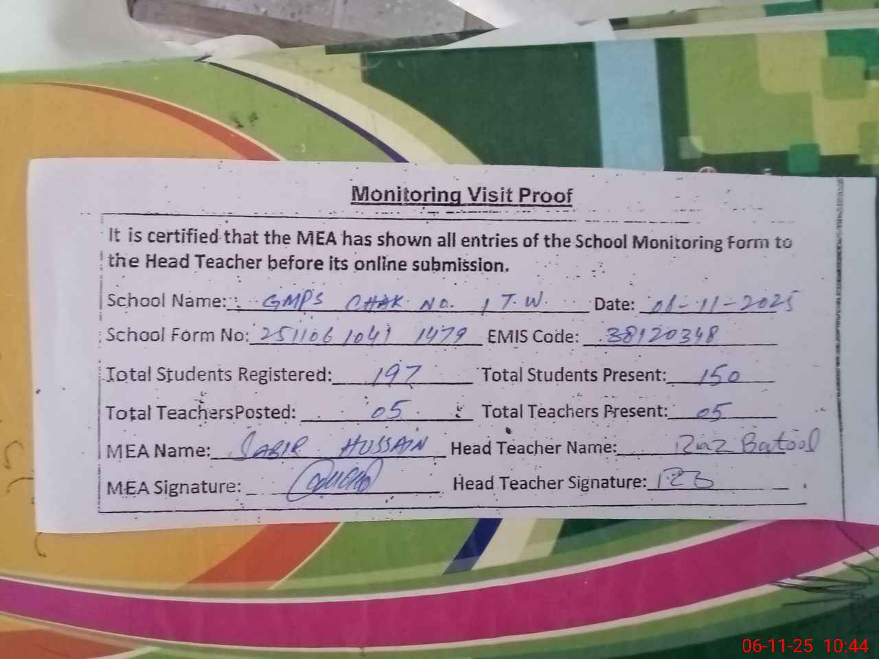 | Remarks (Use Separate Page if Required): Last visit by AEO SABBA ASHRAF on 20 10 2025 | |||||