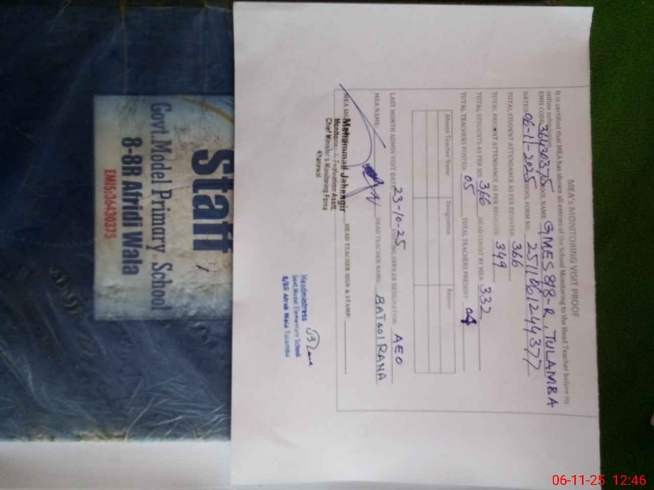 | Certified that this School was Inspected by the Undersigned MEA/DMO Today and the Information Stated Above is as Per Record. | |||||