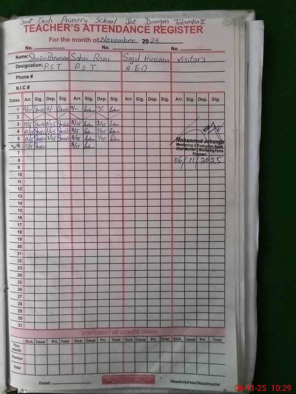 | Monitoring Date: 06-11-2025 | Start Time: 06-11-2025 09:45 AM | End Time: 06-11-2025 10:32 AM | Name of MEA: Mu**** Ja**** | |