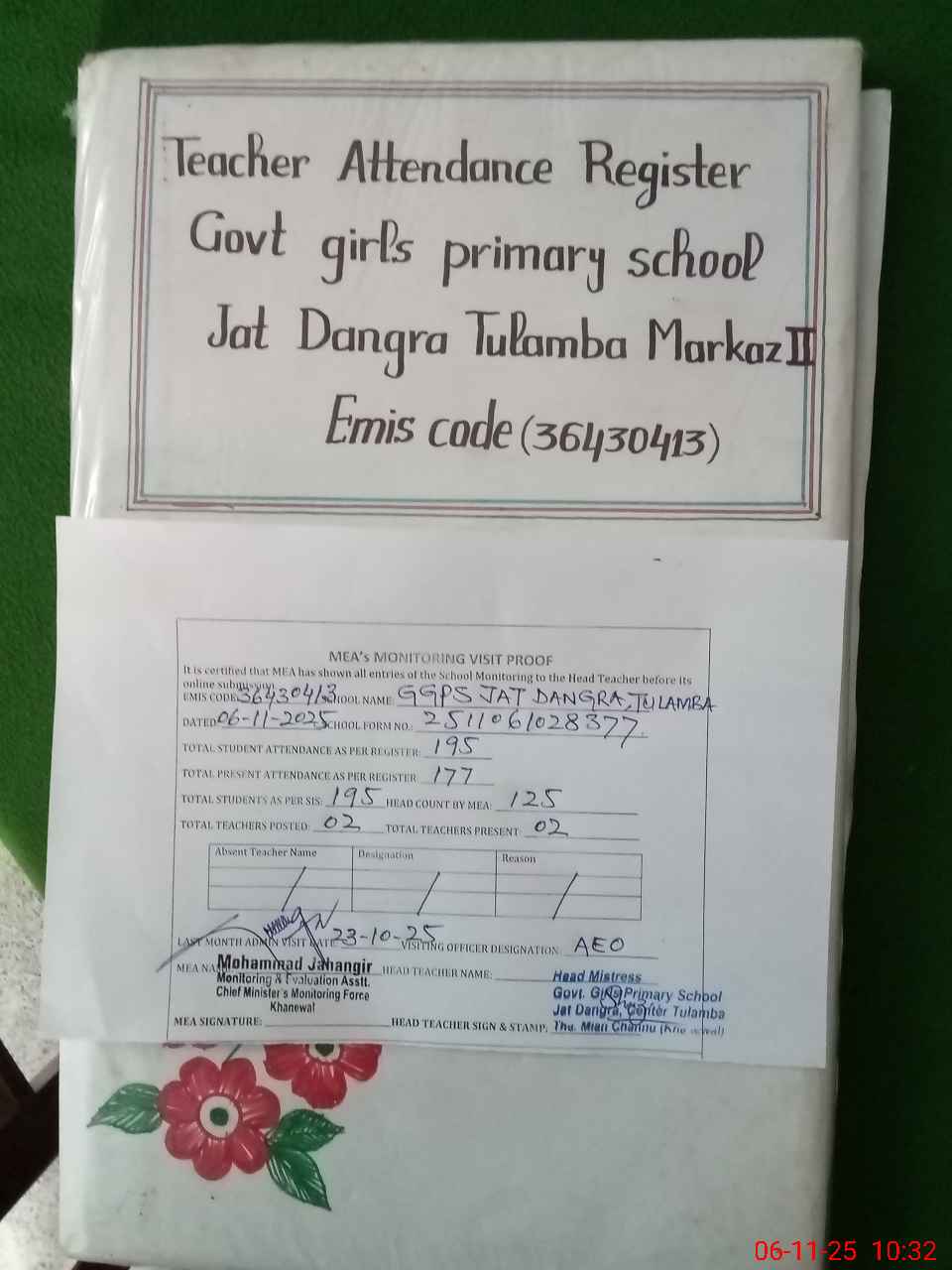 | Attendance Register | Head Teacher | MEA with School | Visit Proof |