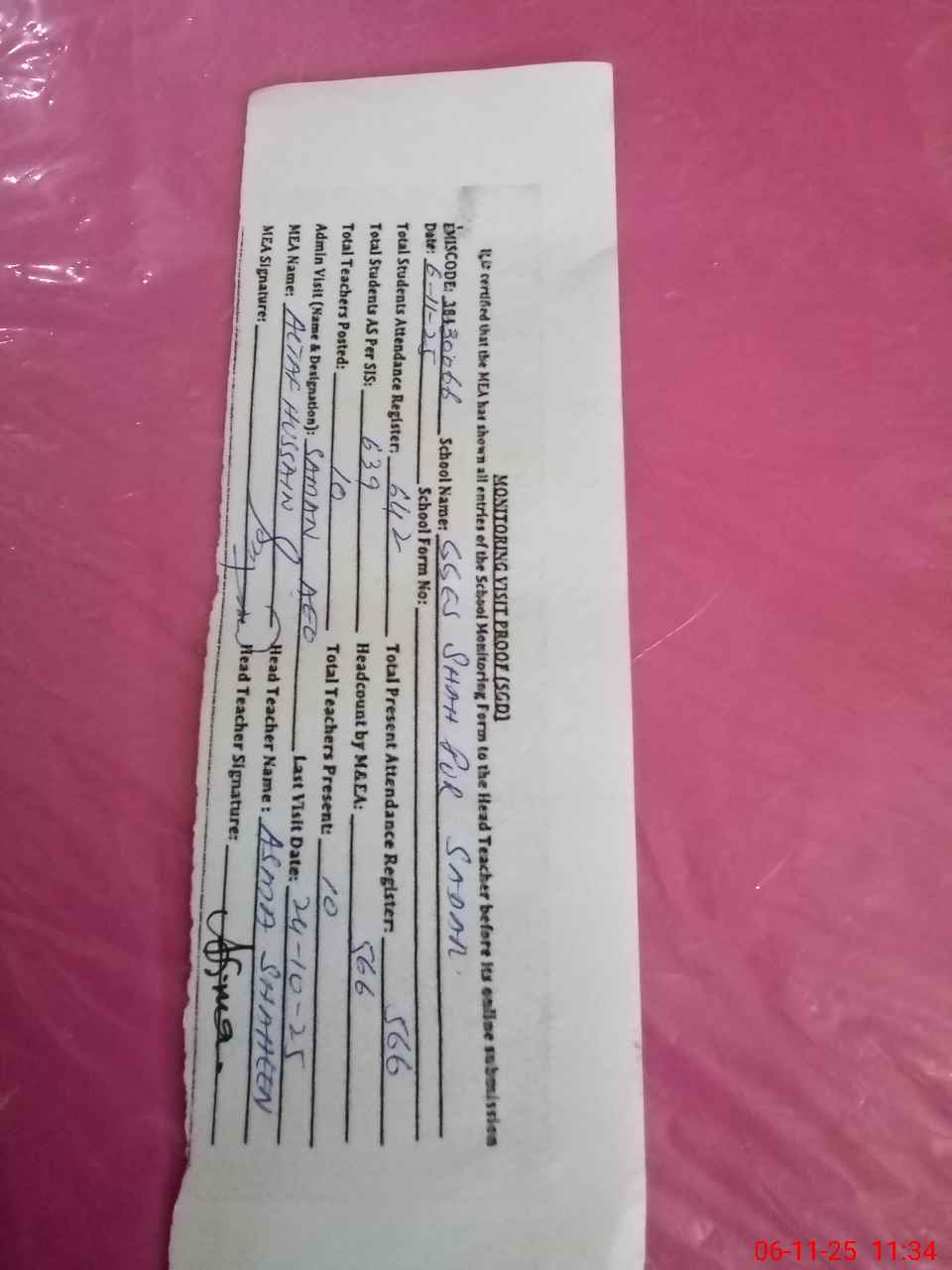 | Attendance Register | Head Teacher | MEA with School | Visit Proof |