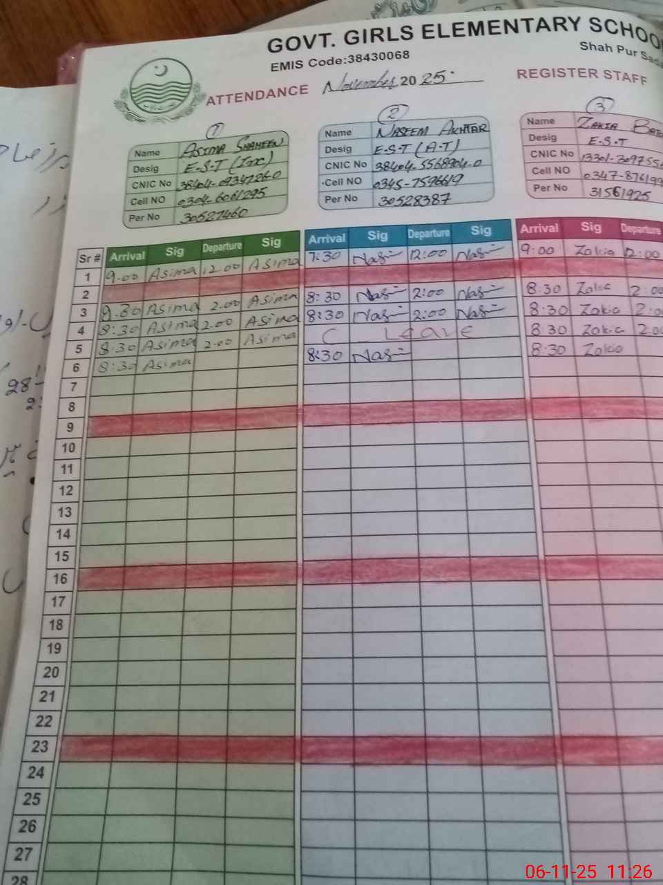 | CNIC | Full Name | Designation | R/C | Absence during last cal. month |