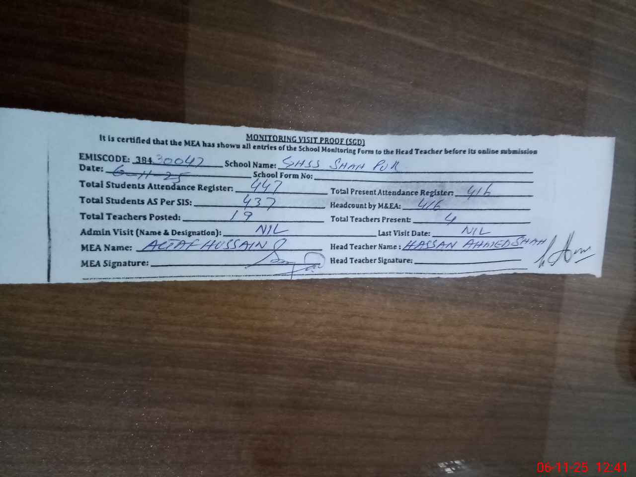 | Attendance Register | Head Teacher | MEA with School | Visit Proof |