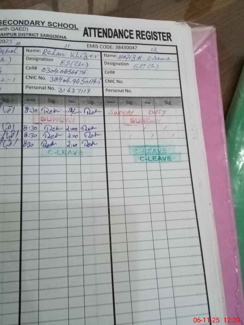 | CNIC | Full Name | Designation | R/C | Absence during last cal. month |