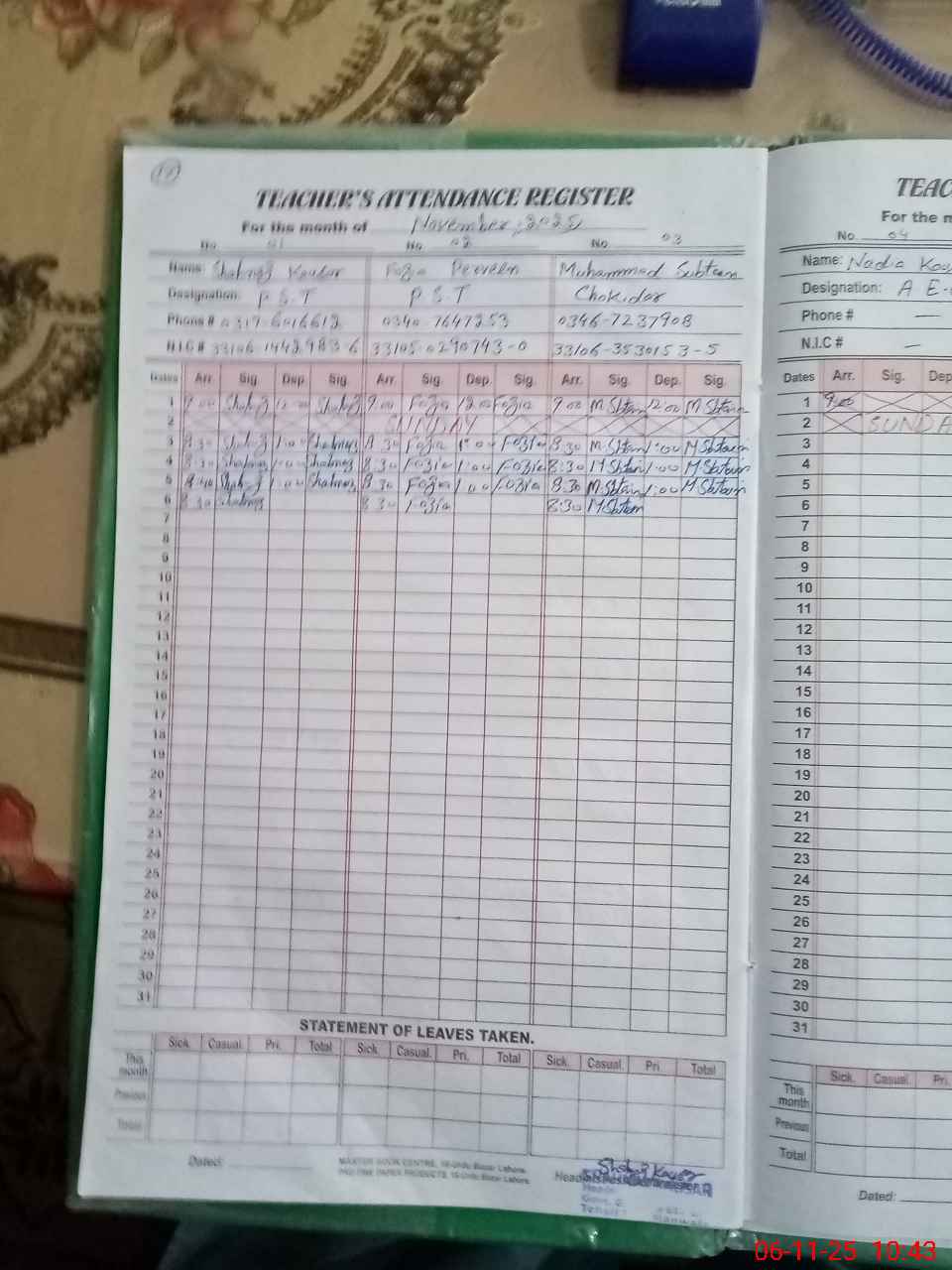 | CNIC | Full Name | Designation | R/C | Absence During Last Calender Month |