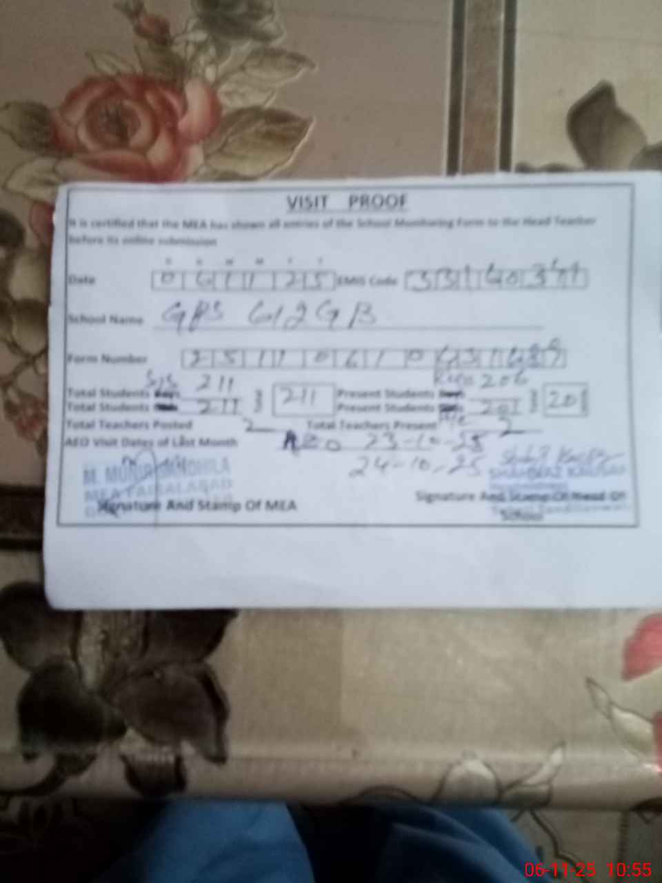 | Attendance Register | Head Teacher | MEA with School | Visit Proof |