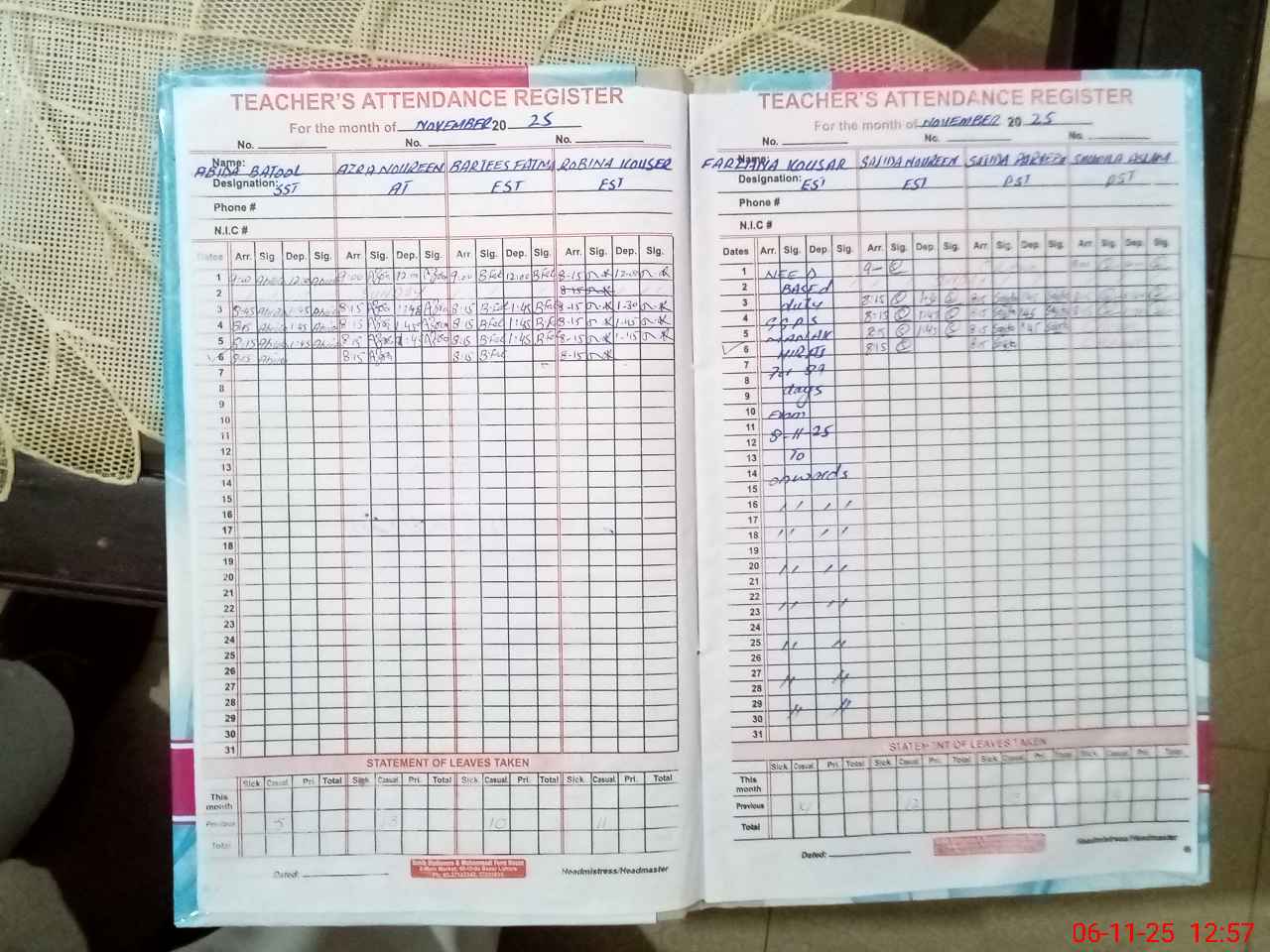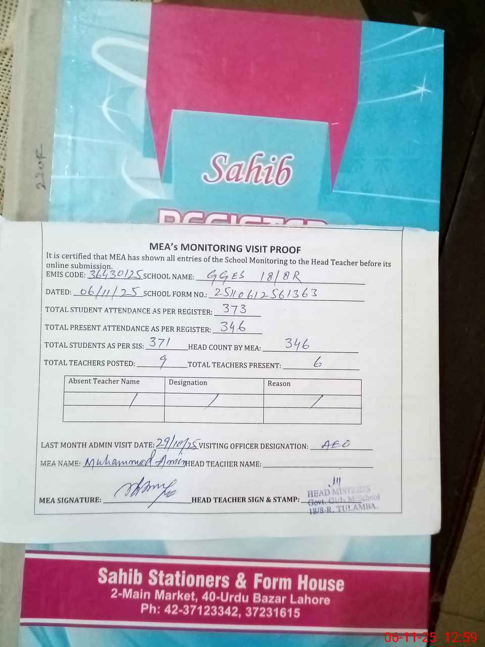 | Attendance Register | Head Teacher | MEA with School | Visit Proof |