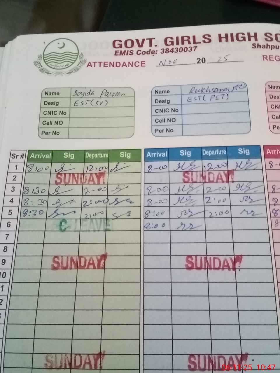| CNIC | Full Name | Designation | R/C | Absence During Last Calender Month |