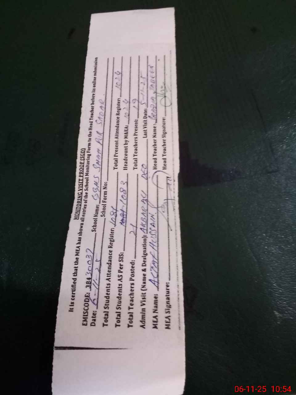 | Attendance Register | Head Teacher | MEA with School | Visit Proof |