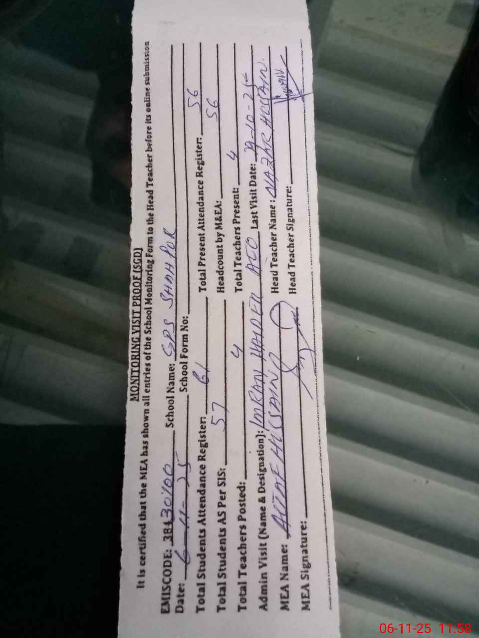 | Attendance Register | Head Teacher | MEA with School | Visit Proof |