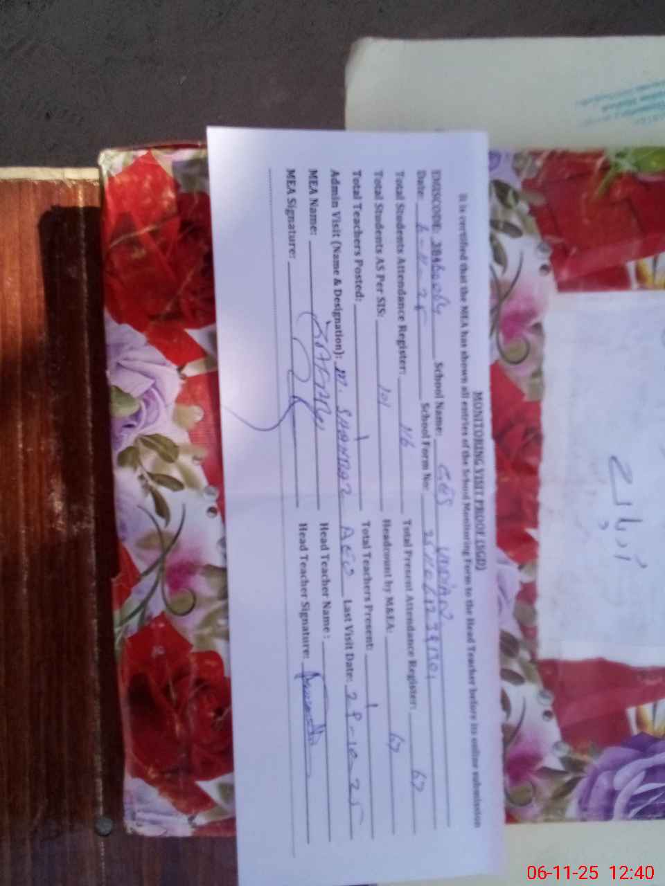 | Attendance Register | Head Teacher | MEA with School | Visit Proof |