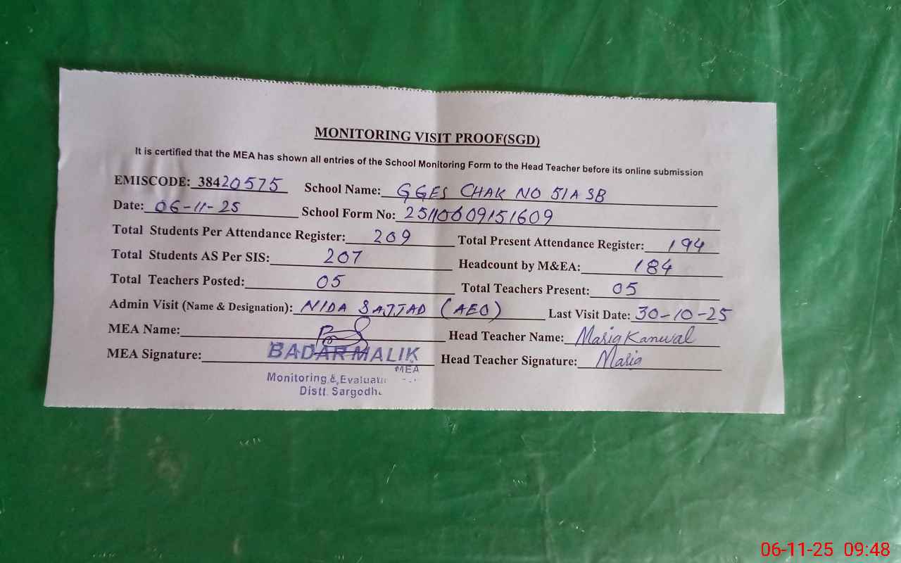 | EMIS Code: 38420575 | Name of School: GGES CHAK NO.51 A SB | |||
