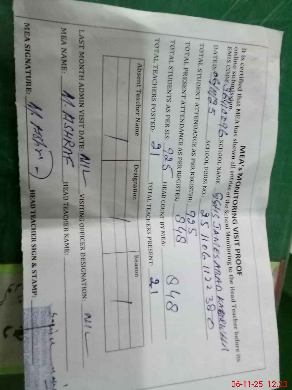 | Attendance Register | Head Teacher | MEA with School | Visit Proof |