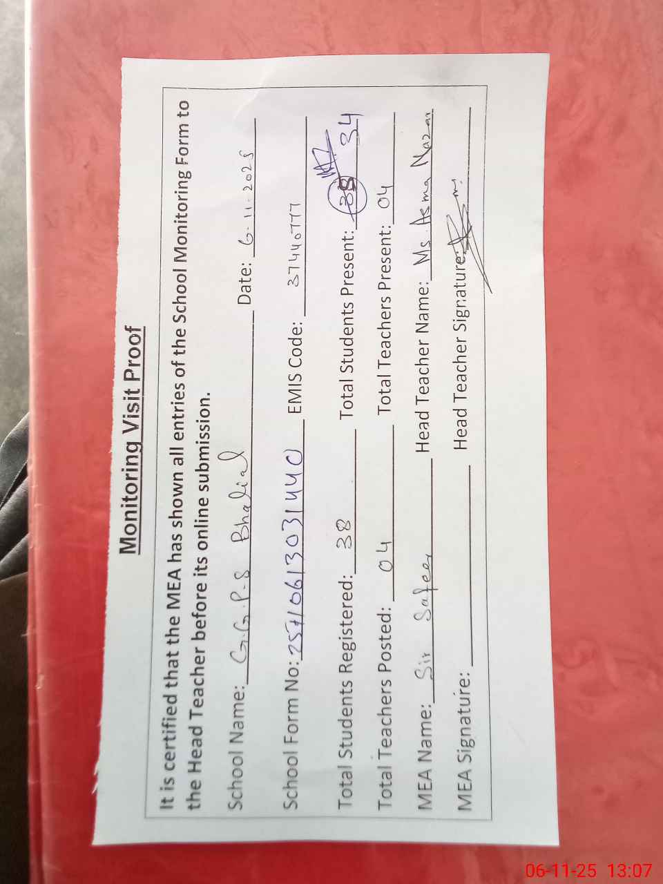 | Attendance Register | Head Teacher | MEA with School | Visit Proof |