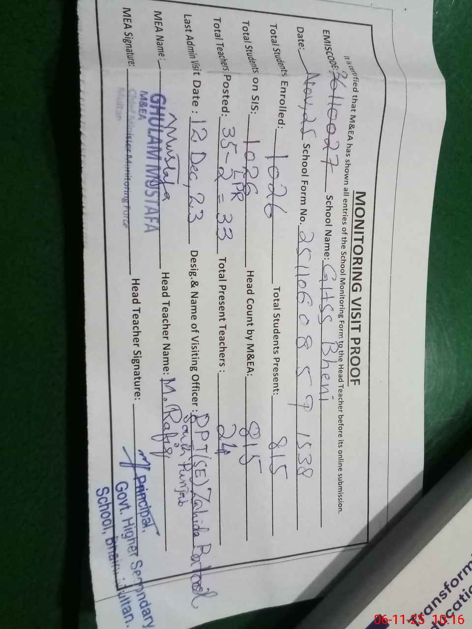| Certified that this School was Inspected by the Undersigned MEA/DMO Today and the Information Stated Above is as Per Record. | |||||