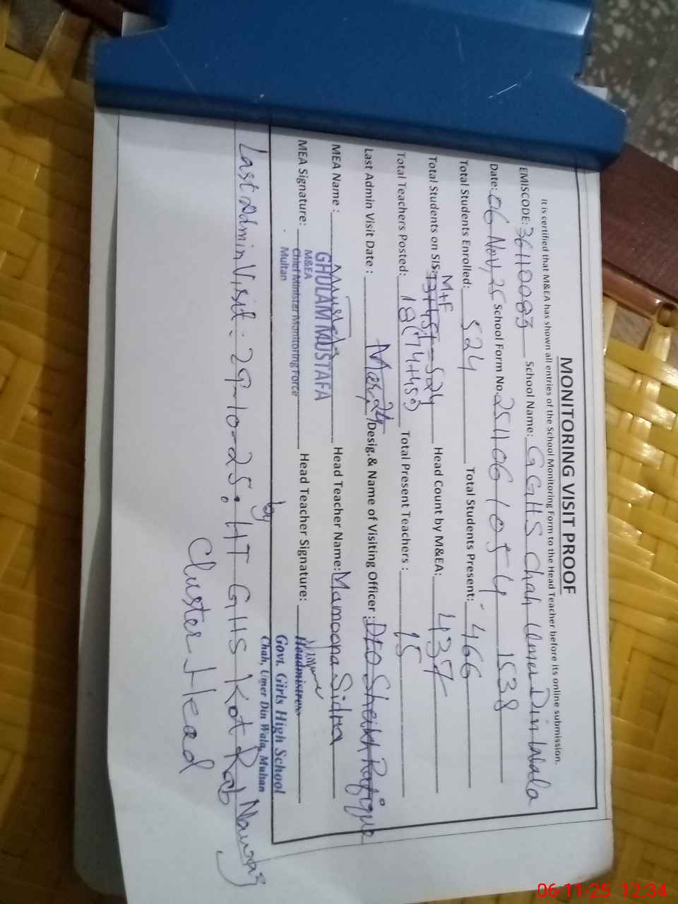 | Attendance Register | Head Teacher | MEA with School | Visit Proof |