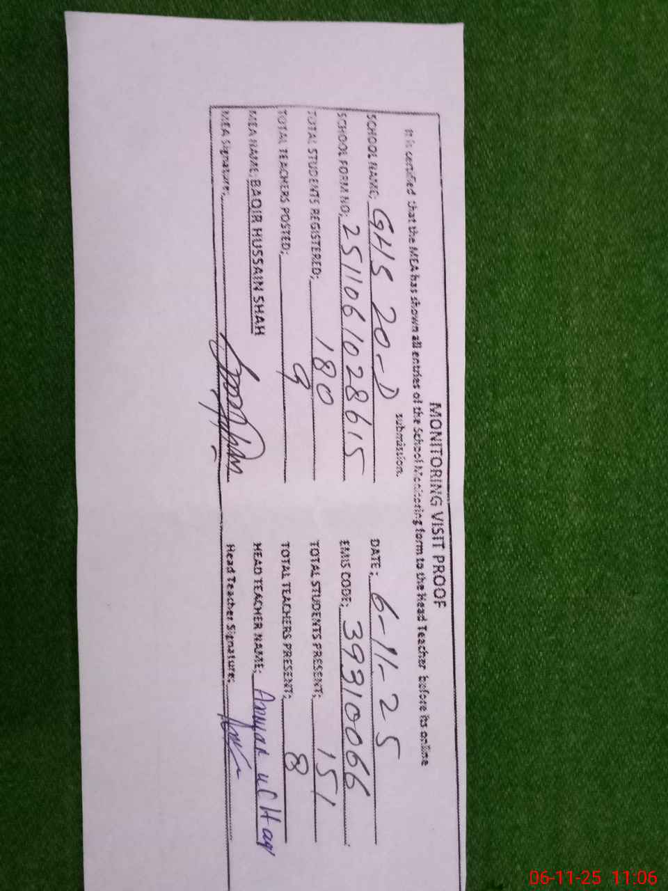 | Attendance Register | Head Teacher | MEA with School | Visit Proof |