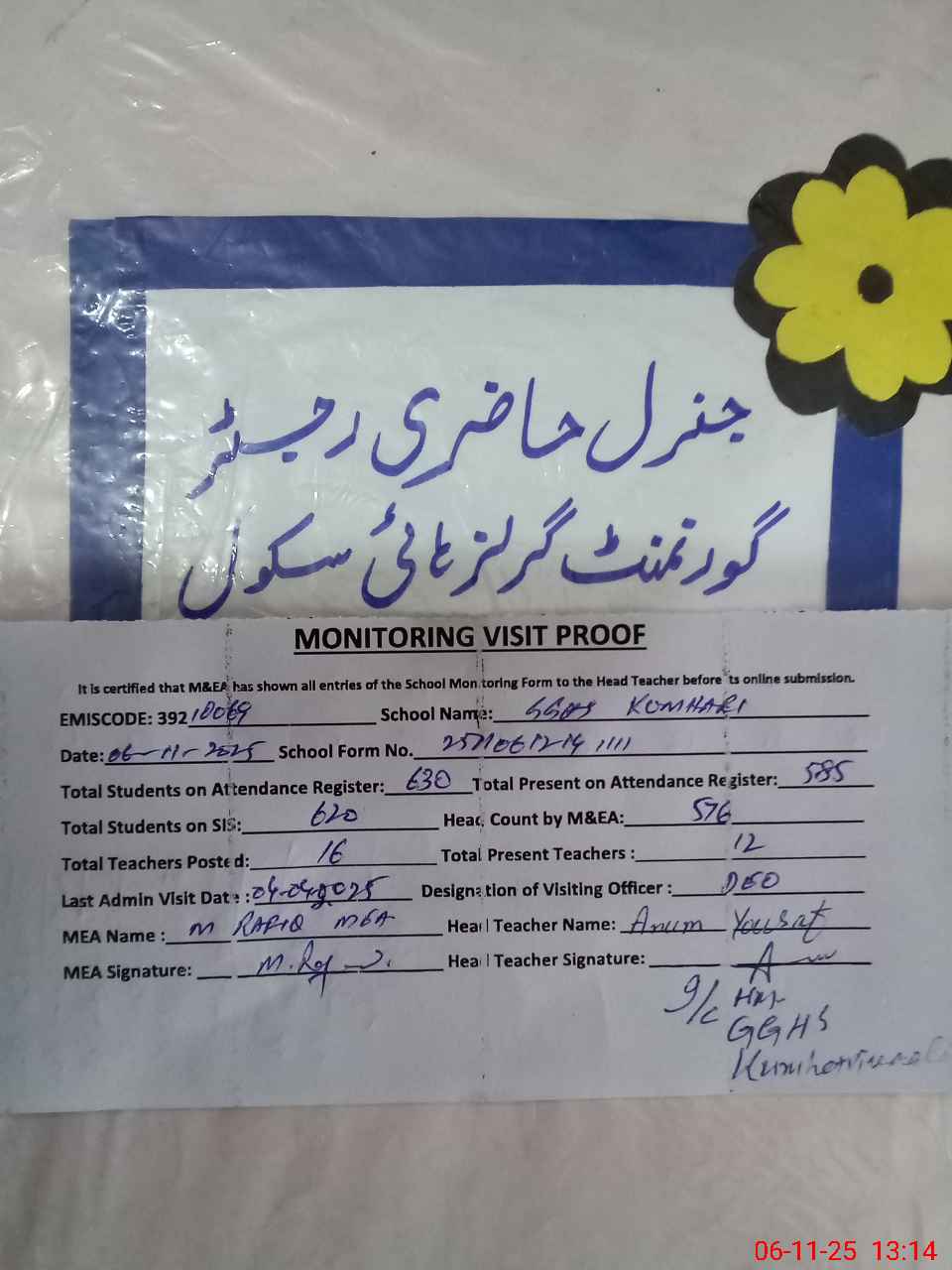 | EMIS Code: 39210069 | Name of School: GGHS KOMHARI WALA | |||