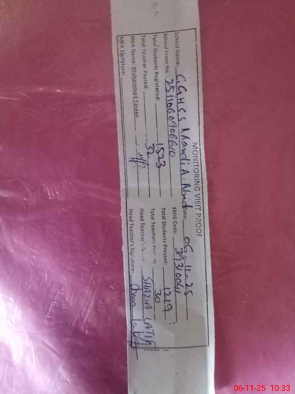 | Attendance Register | Head Teacher | MEA with School | Visit Proof |