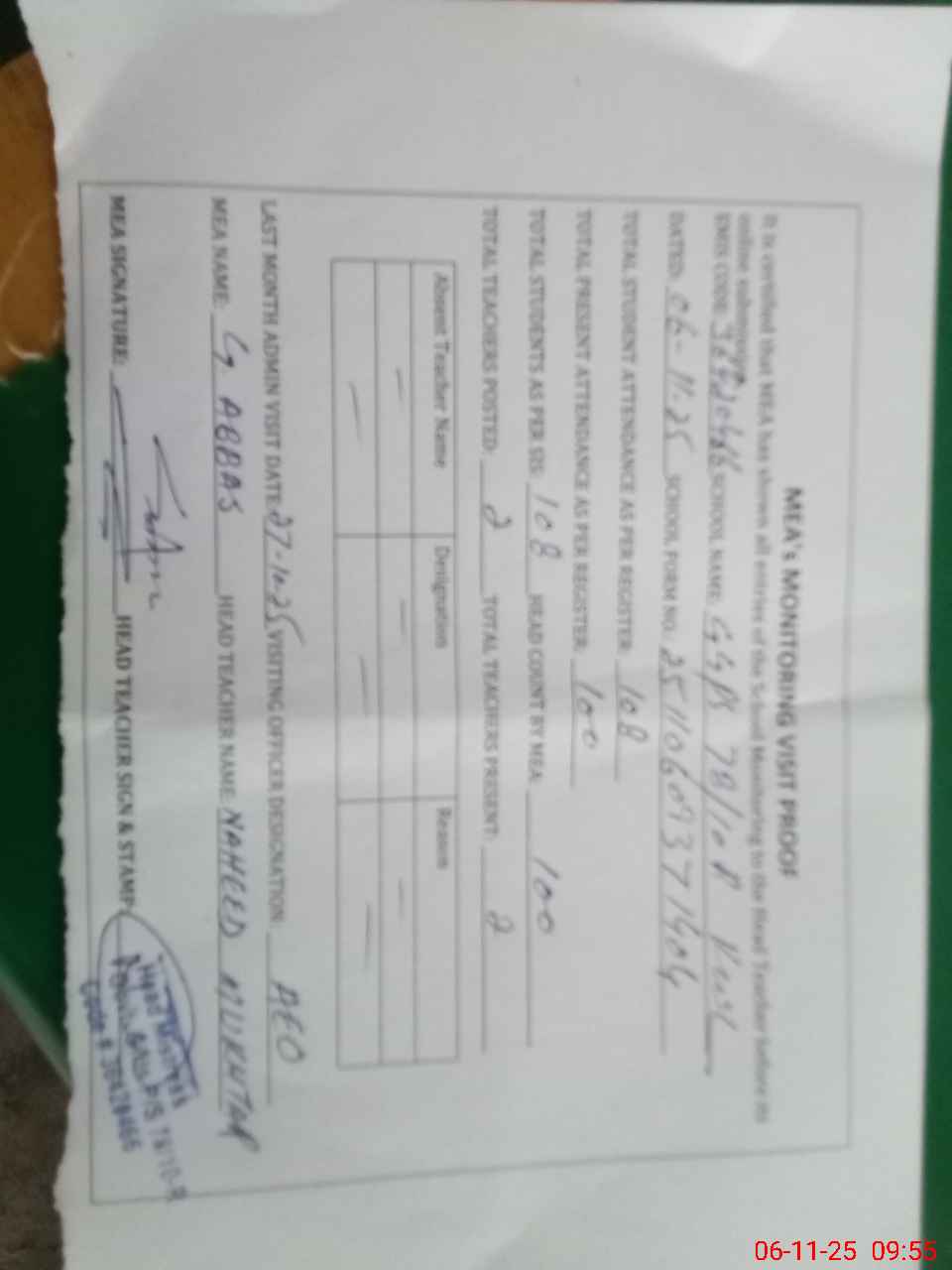 | Attendance Register | Head Teacher | MEA with School | Visit Proof |