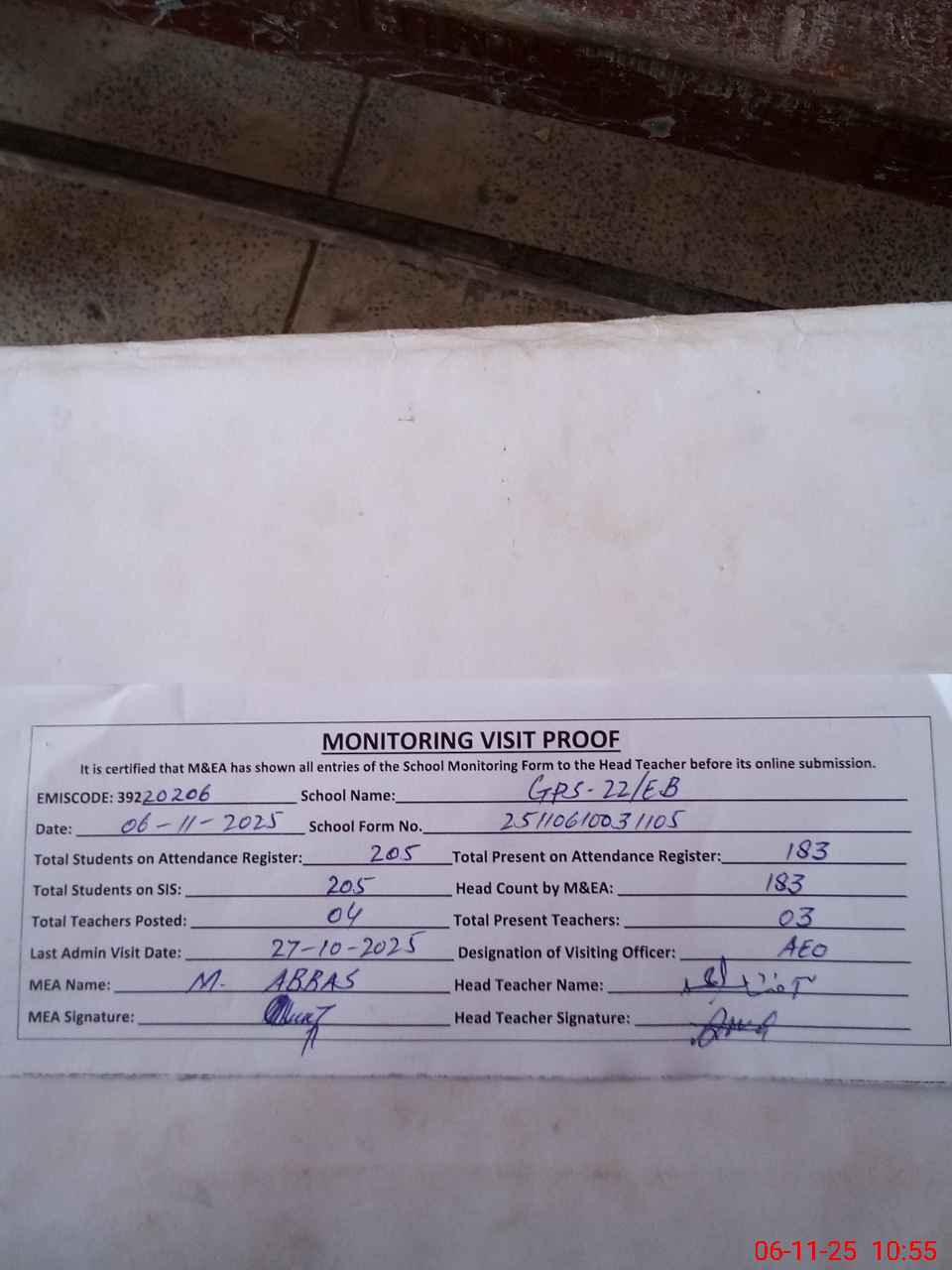 | Attendance Register | Head Teacher | MEA with School | Visit Proof |