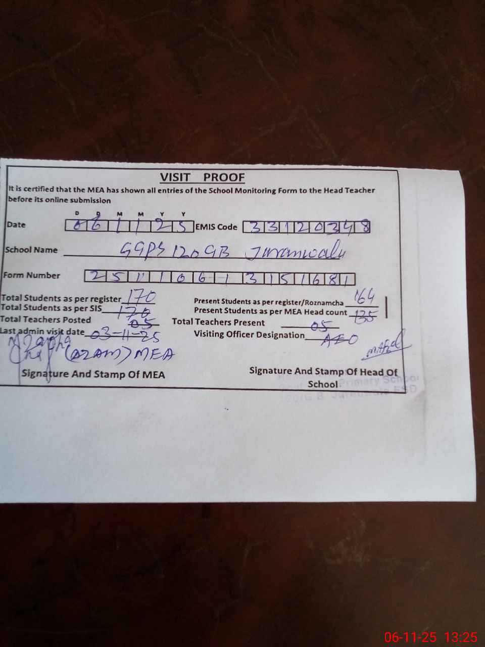 | Attendance Register | Head Teacher | MEA with School | Visit Proof |