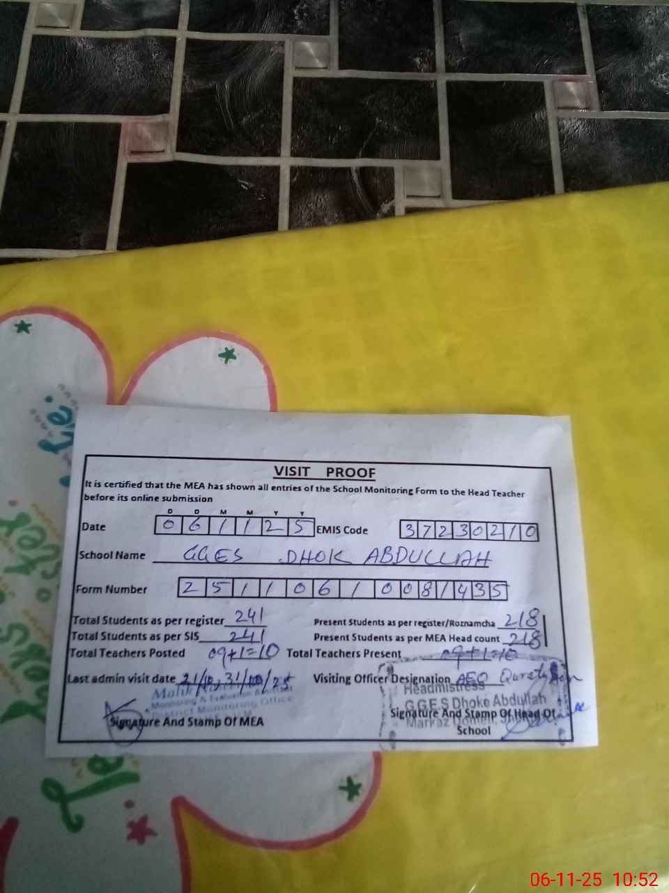 | Attendance Register | Head Teacher | MEA with School | Visit Proof |