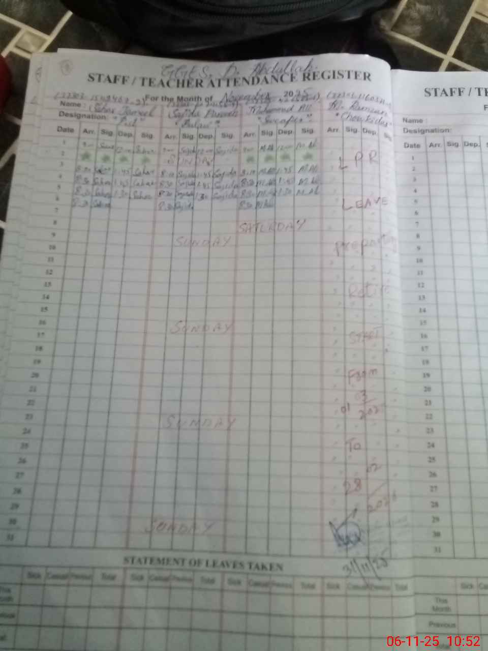 | Leave | Duty | Absent | Maternity | Medical | Ex- Pak |